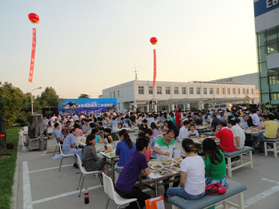 24日下午,公司辦公樓前,擺放著一排排桌椅,員工們從餐廳端著盛滿豐盛食物的餐盤,擺放在餐桌上。南面的舞臺上,工作人員在緊張的調(diào)試音響,兩只紅色的氫氣球飄揚(yáng)在空中,在蔚藍(lán)的天空映襯下,格外的鮮艷,為整個會場增添了喜慶的氣氛。